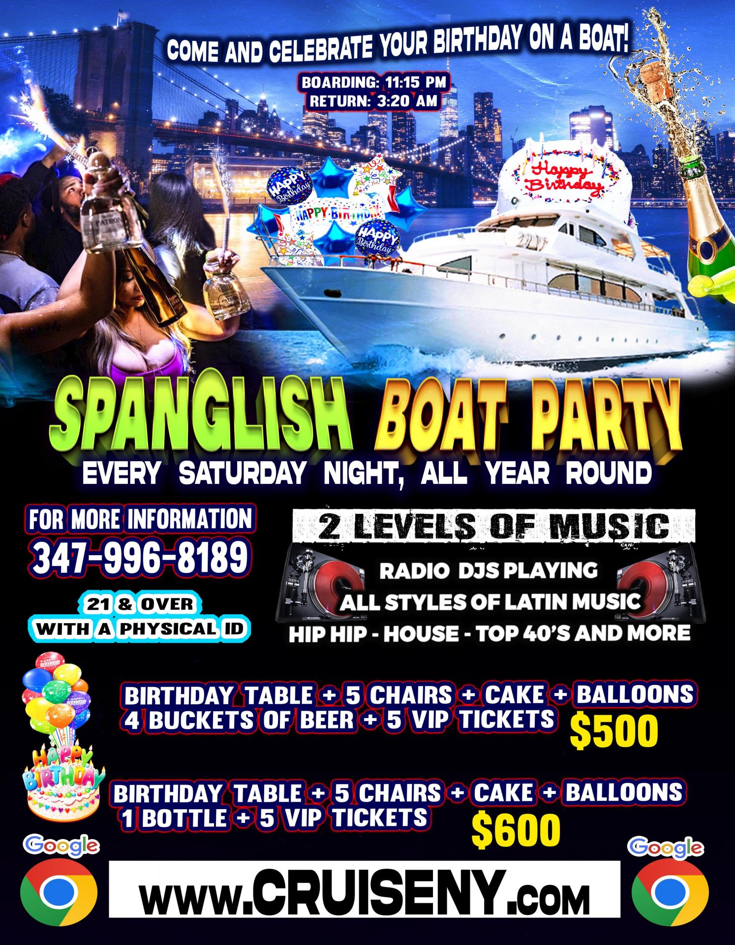 🌟 The Hottest Late-Night Cruise in NYC! Get ready to sail through the heart of the harbor. The Spanglish Boat Party returns for a high-energy night where Latin heat meets the New York City skyline. Join hundreds of party-goers for a spectacular cruise around the Statue of Liberty and experience the city lights like never before. This is where the music has no borders!